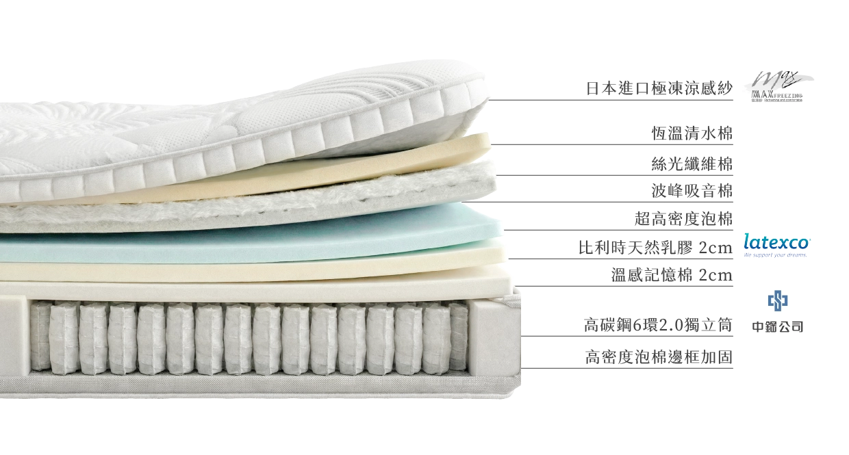 MAX FREEZING®日本極凍涼感紗 x LATEX CO®比利時天然乳膠 x 抗干擾記憶棉層 x 高碳鋼蜂巢式獨立筒