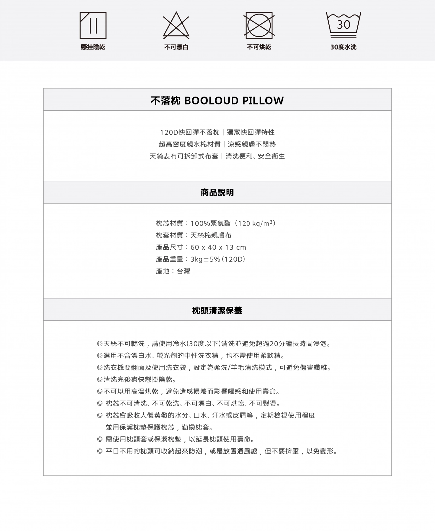 - 枕套使用天絲親膚棉,120kg/m³ 超高密度親水棉材質,涼感親膚不悶熱
